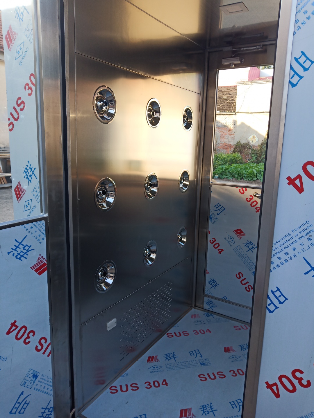 (3)拉開不銹鋼風淋門人員進入風淋室后,風淋門立即自動關閉外門,紅外線(聲控/人體熱能)感應,風淋自動啟動,吹淋15秒(出廠已設置)。注意:風淋室在吹淋時兩個不銹鋼門不能同時打開,如強行打開將損壞電子鎖,風淋室兩門是電子互鎖控制。